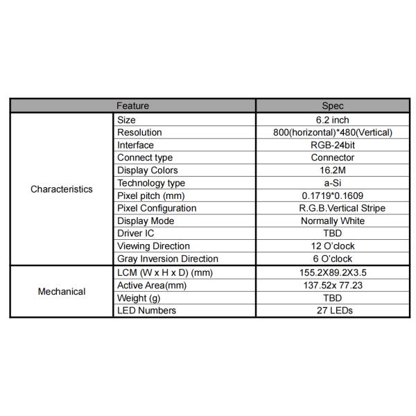 6.2 Inch 800*480 wide temperature TFT LCD Module With RGBInterface 450nits